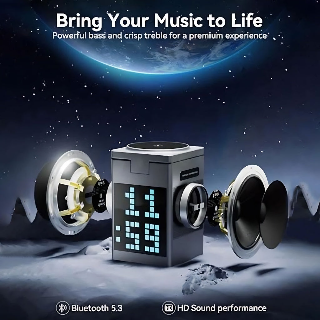 - Bluetooth Speaker: Clear sound with dynamic pixel display animations.