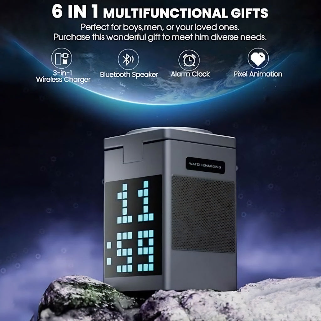 Say goodbye to messy cables and multiple devices—Pixel Dock is the only charging station you’ll ever need. This 5-in-1 wireless charging hub brings convenience, entertainment, and style into a single compact hub, making it the perfect addition to your desk or bedside. Designed for modern tech lovers, Pixel Dock wirelessly charges your smartphone, smartwatch, and earbuds while enjoying as a Bluetooth speaker, smart digital clock, and customizable pixel art display. From work to relaxation, Pixel Dock keeps you charged, connected, and entertained—all in style.